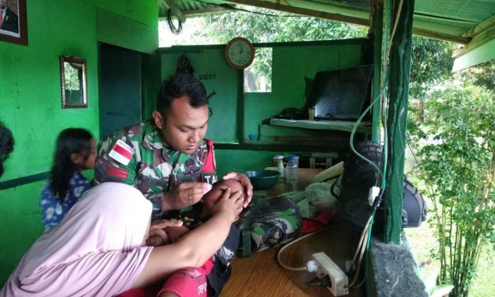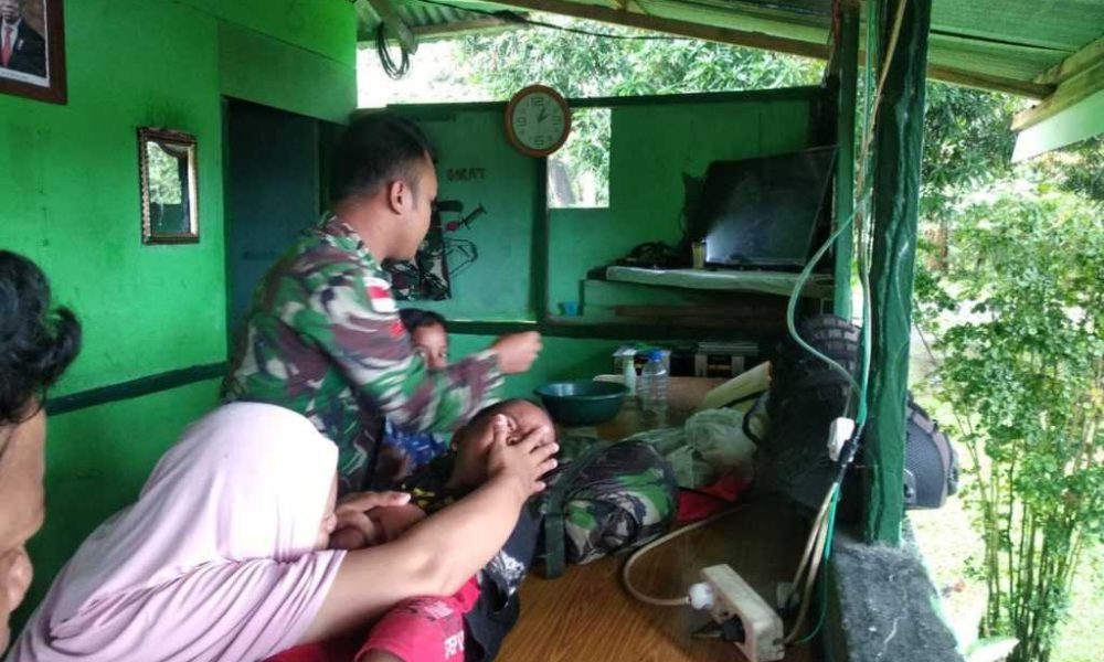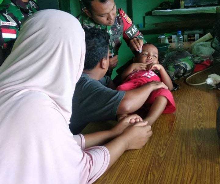 Pendiv2 – Satgas Pamrahwan Maluku Yonarmed 1/Roket/AY/2/2 Kostrad melalui Tim Kesehatan Pos Laha memberikan pertolongan pertama kepada anak yang mengalami kecelakaan yang terjatuh di rumahnya.
