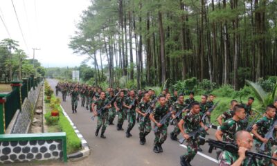 Pendiv2 – Dibawah terik matahari, prajurit Sabadha Yudha melaksanakan lari siang mengelilingi Asmil Yonif Raider 514/SY/9/2 Kostrad di Kabupaten Bondowoso dengan membawa senjata kelompok yang ada...