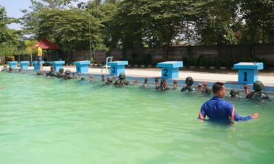 Prajurit Yonif R 514/SY/9/ 2 Kostrad dipimpin Ltt Inf Chandra dengan penuh semangat melaksanakan latihan renang militer di kolam renang Tirta Balawara Yudha di Asmil Yonif...