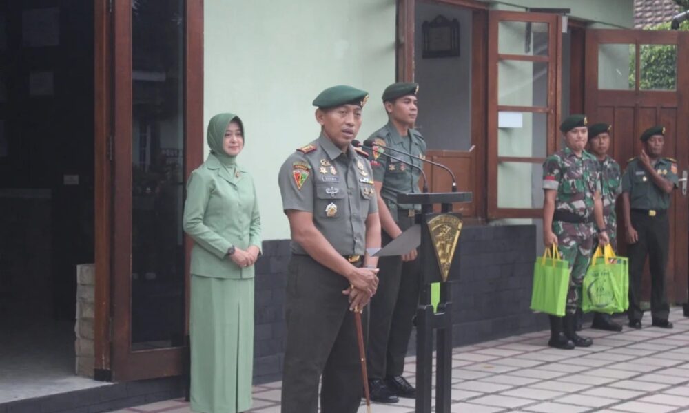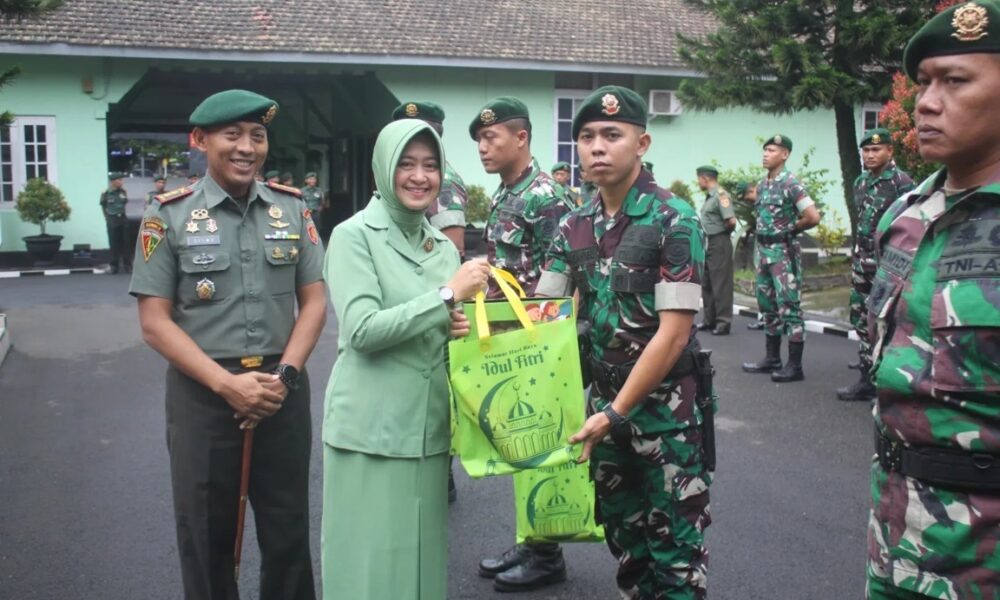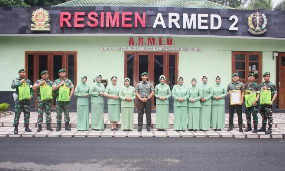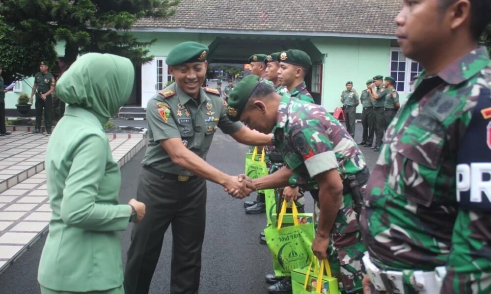 Pendiv2 – Komandan Resimen Armed 2 Putra Yudha Letkol Arm Siswo Budiarto, S.I.P., M.M., M.I.Pol. bersama Ketua Persit Kartika Chandra Kirana Cabang XXIII Menarmed 2 Koorcab Divif 2 PG Kostrad Ny. Ani Siswo Budiarto menyerahkan bingkisan Tunjangan Hari Raya dalam rangka menyambut Hari Raya Idul Fitri 1445 Hijriah di Lapangan Hitam Mako Menarmed 2/PY/2 Kostrad. Kamis (01/04/2024).