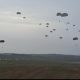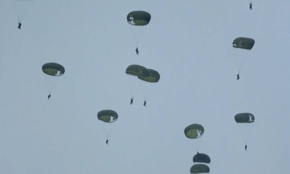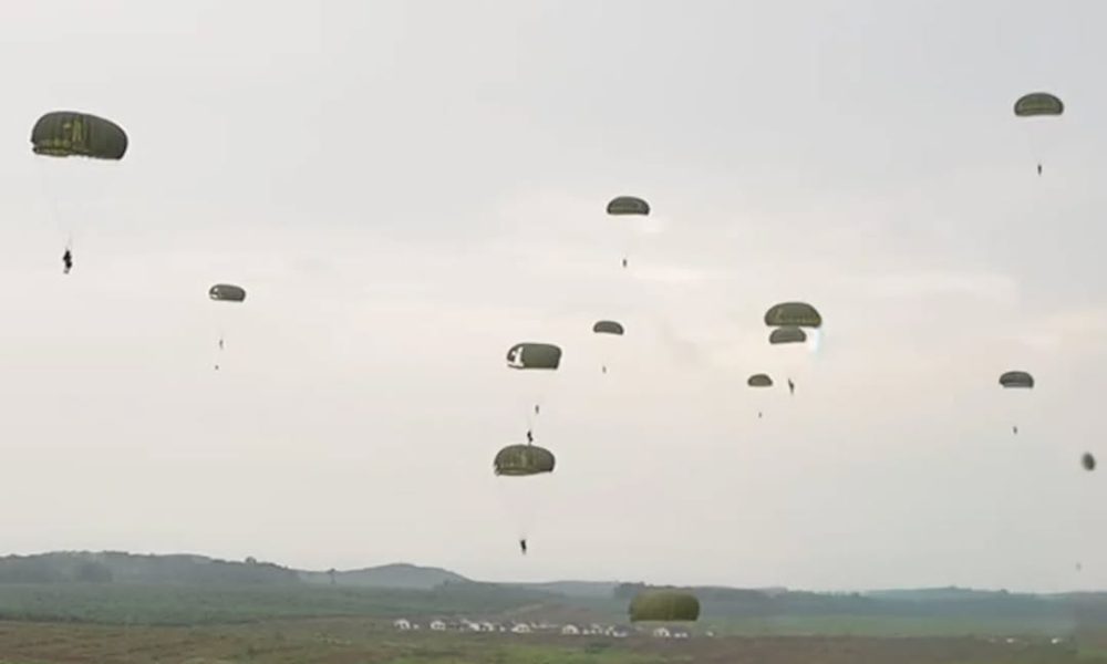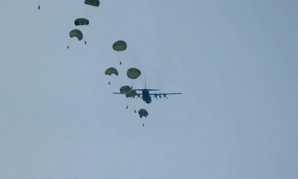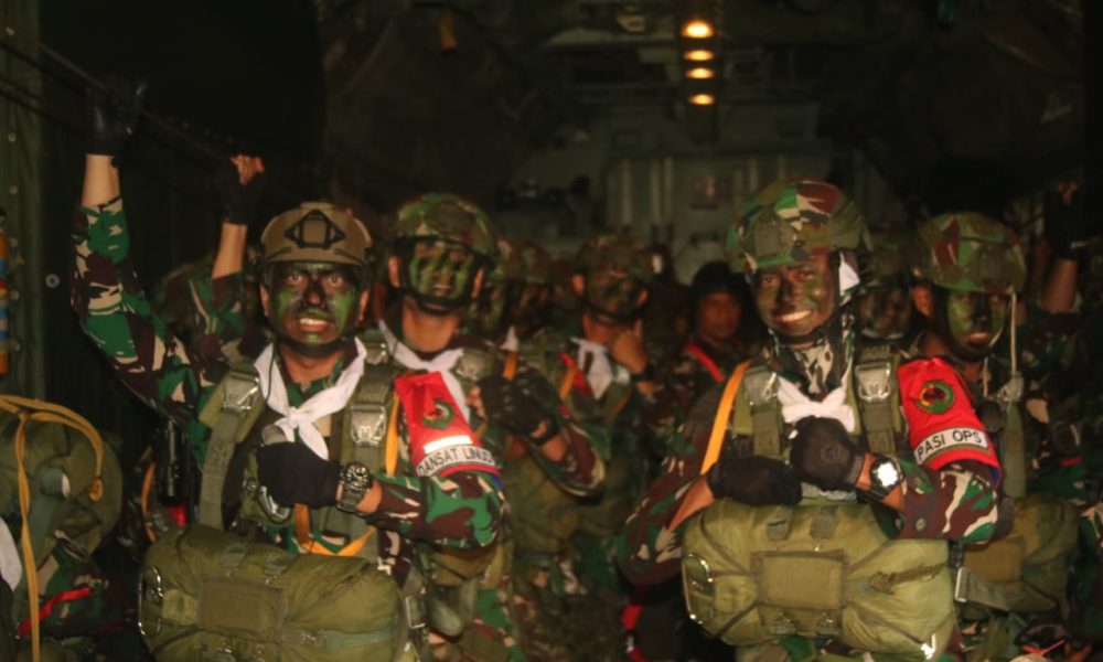 Pendiv2 – Komandan Batalyon Yonif Para Raider 501/BY Divif 2 Kostrad Letkol Inf I Gusti Bagus Prayuda pimpin ratusan peterjun, hiasi langit Pulau Timah melaksanakan penerjunan lintas udara (linud) sebagai bagian dari latihan terpadu berskala besar yang melibatkan seluruh matra TNI yang digelar di Desa Mabat. (Bangka Belitung, Rabu 19/11/2025).