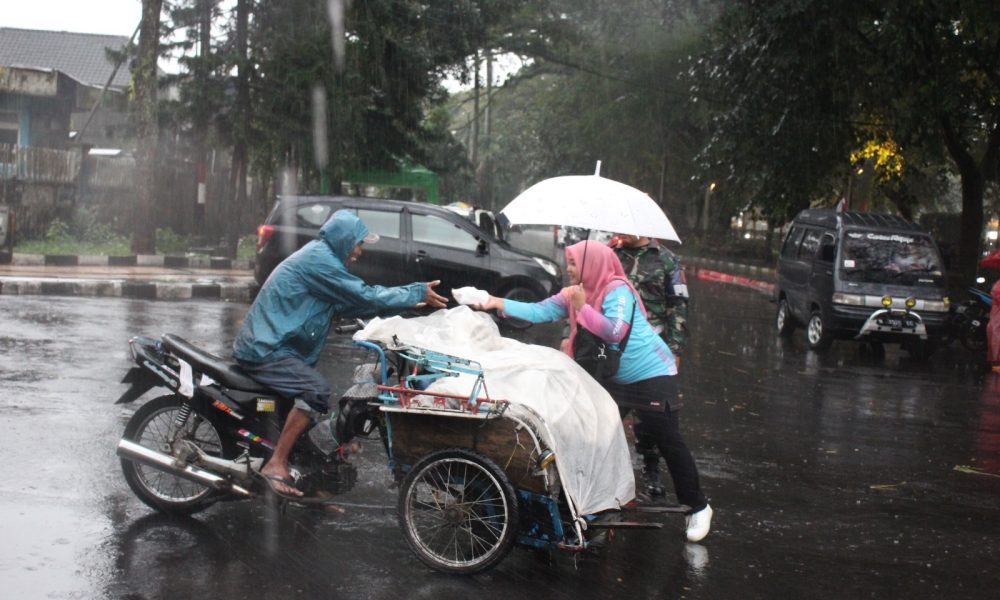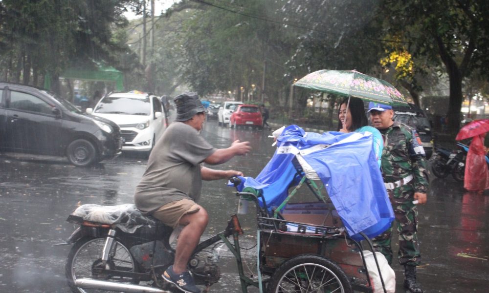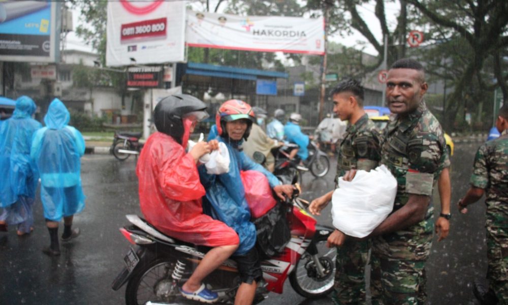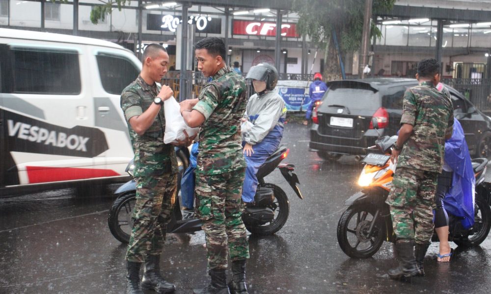 Diguyur Hujan Deras Prajurit Yonbekang 2 Kostrad Tetap Laksanakan Pembagian Takjil Depan Stasiun