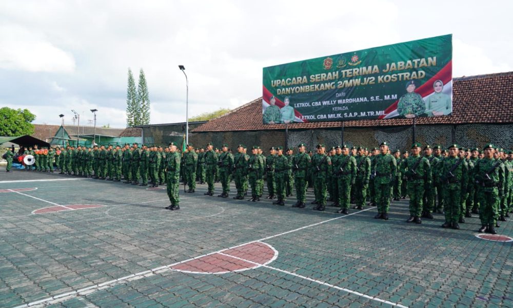 Pendiv2- Markas Yonbekang 2/MWJ/2 Kostrad hari ini menjadi saksi bisu moment bersejarah ketika Panglima Divisi Infanteri 2 Kostrad, Mayjen TNI Primadi Saiful Sulun, S.Sos., M.Si., memimpin langsung prosesi serah terima jabatan Komandan Batalyon Perbekalan dan Angkutan 2/MWJ/2 Kostrad. (Malang, 10 Maret 2026).