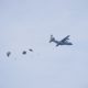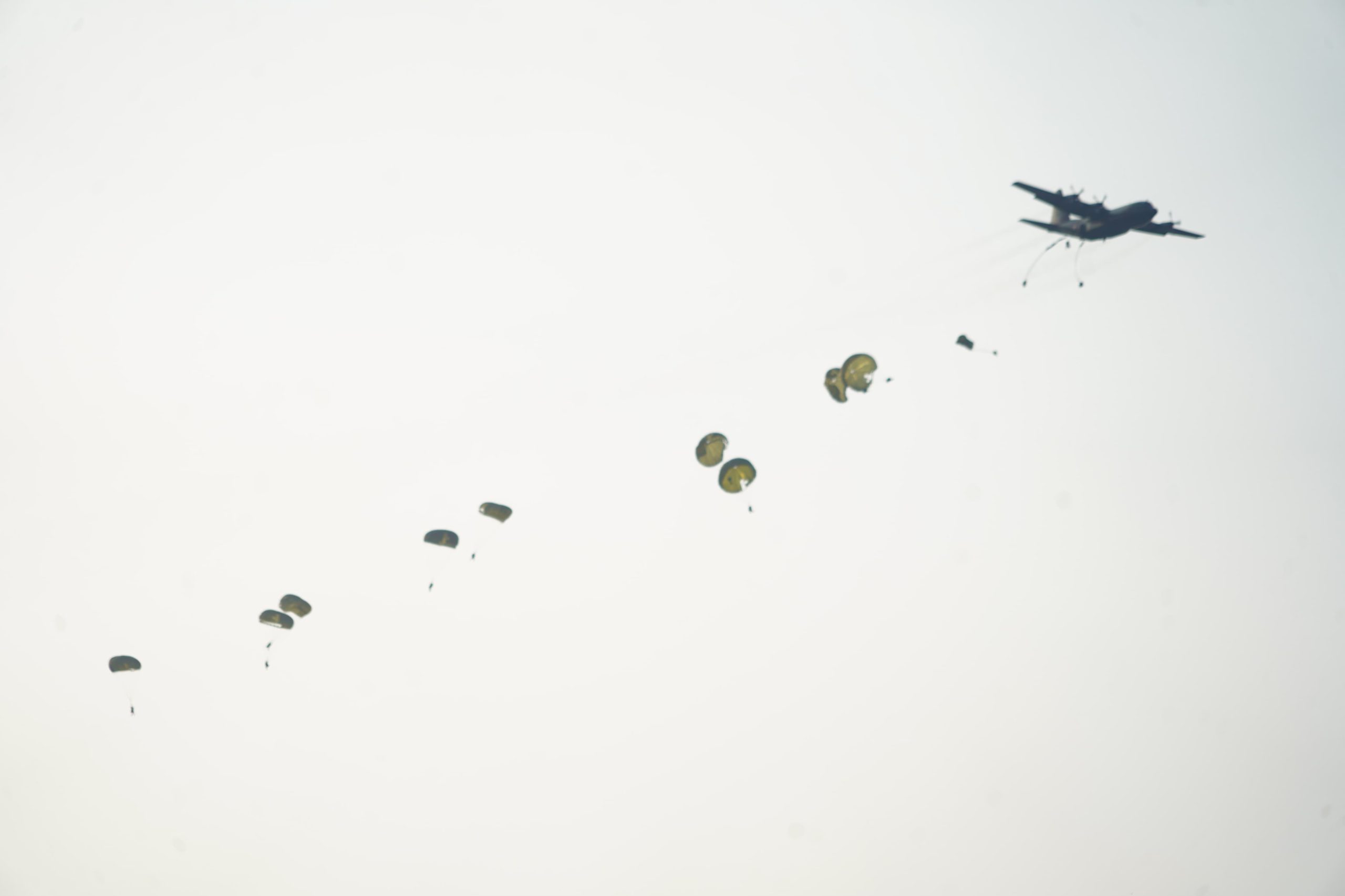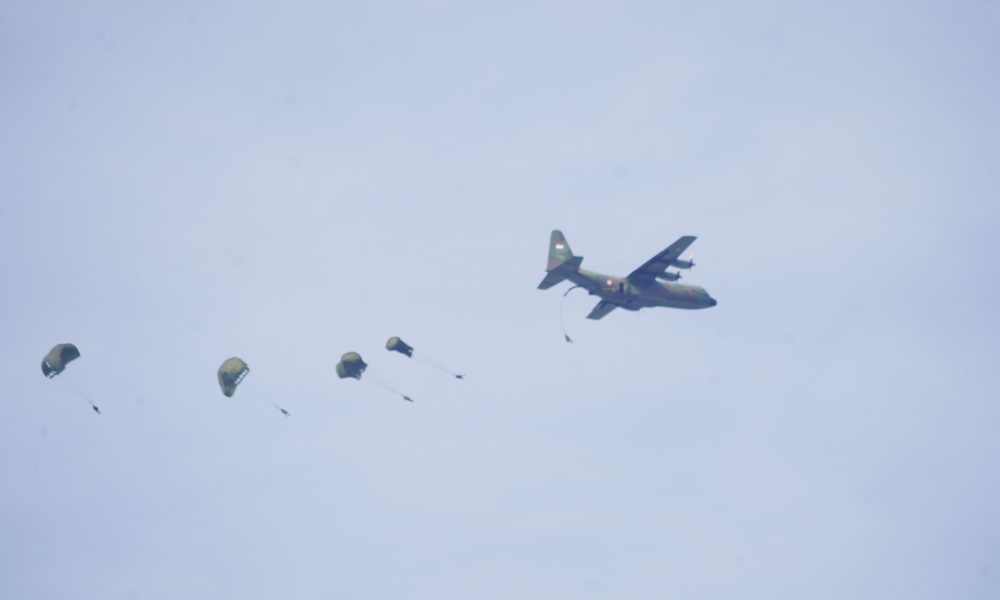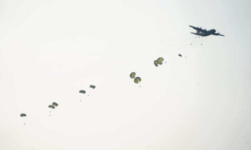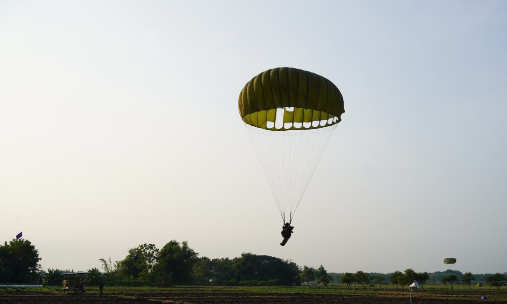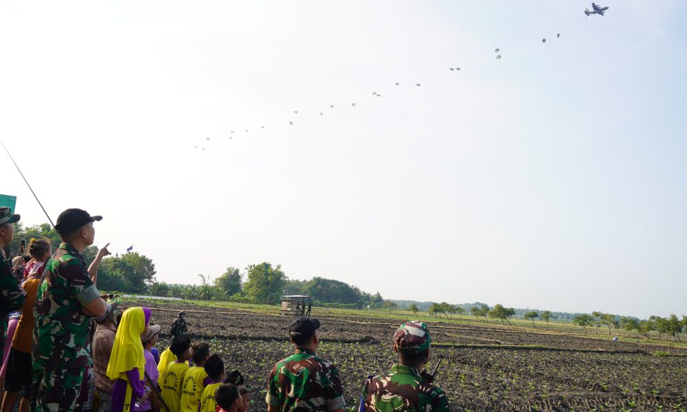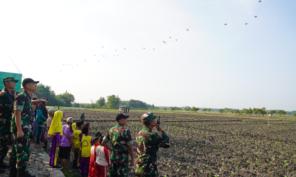 Pendiv2 – Kilauan parasut mengembang di angkasa Jombang, menyuarakan semangat prajurit terlatih Yonif 503/Mayangkara/18/2 Kostrad dalam Latihan Terjun Statik penyegaran (Jungar). Ratusan prajurit berkualifikasi Para membuktikan kapabilitasnya dalam tiga gelombang penerjunan menggunakan pesawat C-130/Hercules milik TNI AU. Jombang (17/7/2025).
