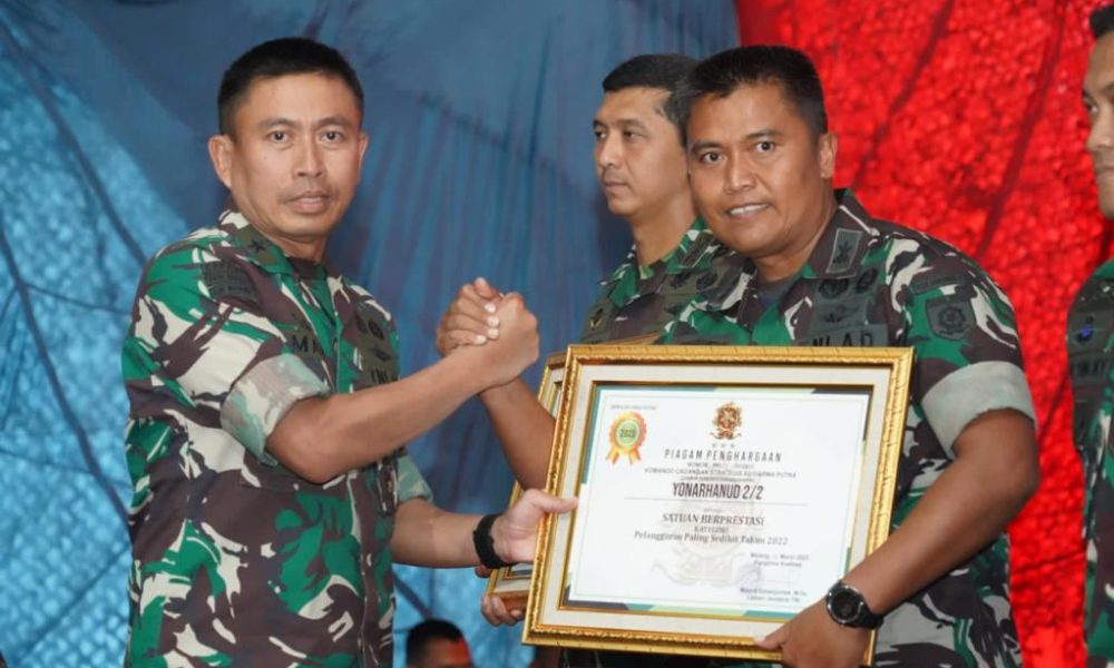 Pendiv2 – Danyon Arhanud 2/ABW/2 Kostrad Letkol Arh Setu Wibowo,S.Hub., Int. menerima Piagam Penghargaan Sebagai Satuan Berprestasi pada Rapat Pimpinan dan Apel Komandan Satuan Kostrad TA. 2023 yang diikuti oleh seluruh Komandan Satuan jajaran Kostrad yang dilaksankan terpusat di Markas Divif 2 Kostrad Singosari. Jumat (17/3/2023).
