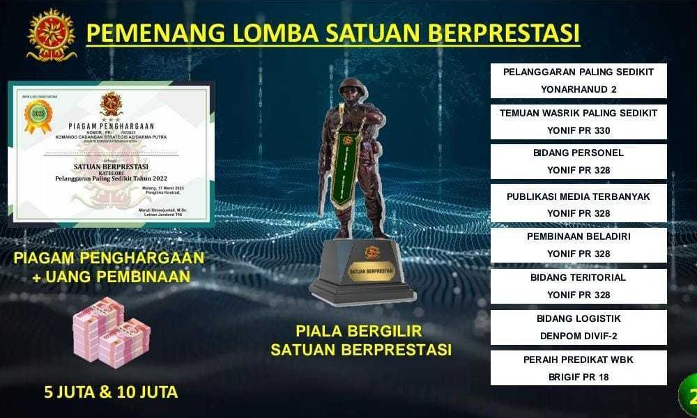 Piagam penghargaan diserahkan oleh Pangkostrad yang diwakili oleh Asisten Intelijen Kaskostrad Brigjen TNI Imam Sampurno Setiawan kepada Danyon Arhanud 2/ABW/2 Kostrad sebagai apresiasi atas pencapaiannya sebagai satuan yang pelanggaranya paling sedikit.