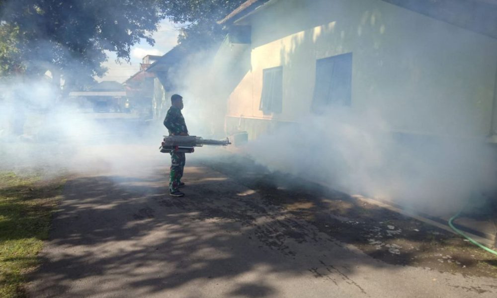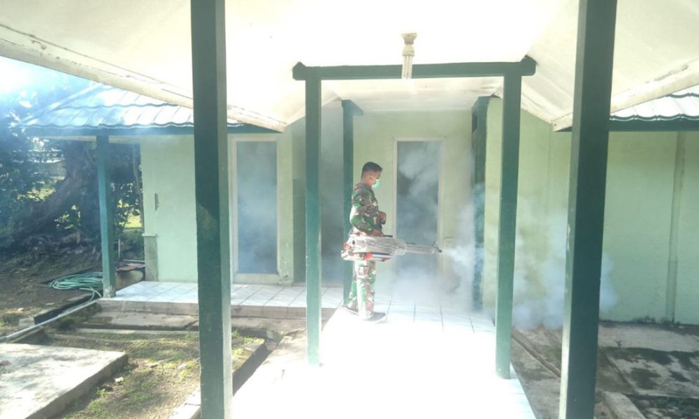 Pendiv2 – Dalam rangka peduli kesehatan lingkungan dan pencegahan penularan penyakit Demam Berdarah Dengue (DBD), Peleton Kesehatan Yonif Mekanis Raider 413/Bremoro/6/2 Kostrad melaksanakan penyemprotan Fogging di seluruh area Asrama Yonif Mekanis Raider 413/Bremoro. Minggu (22/1/2023).