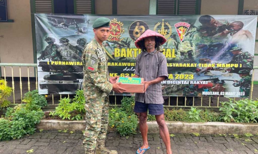 Pendiv2 – Dalam rangka memperingati 62 tahun pengabdian kepada negara Indonesia, Komando Cadangan Strategis Angkatan Darat (Kostrad) sebagai salah satu pasukan dasar tempur yang dimiliki oleh TNI AD menggelar rangkaian kegiatan dijajaran Satuan Kostrad yang berada di berbagai wilayah Indonesia, Yonarmed 11/76 Trk/GG/2/2 Kostrad menggelar bhakti sosial dengan membagikan sembako kepada warakawuri, veteran dan masyarakat sekitar Kota Magelang, Jawa Tengah, Kamis (02/03/2023).