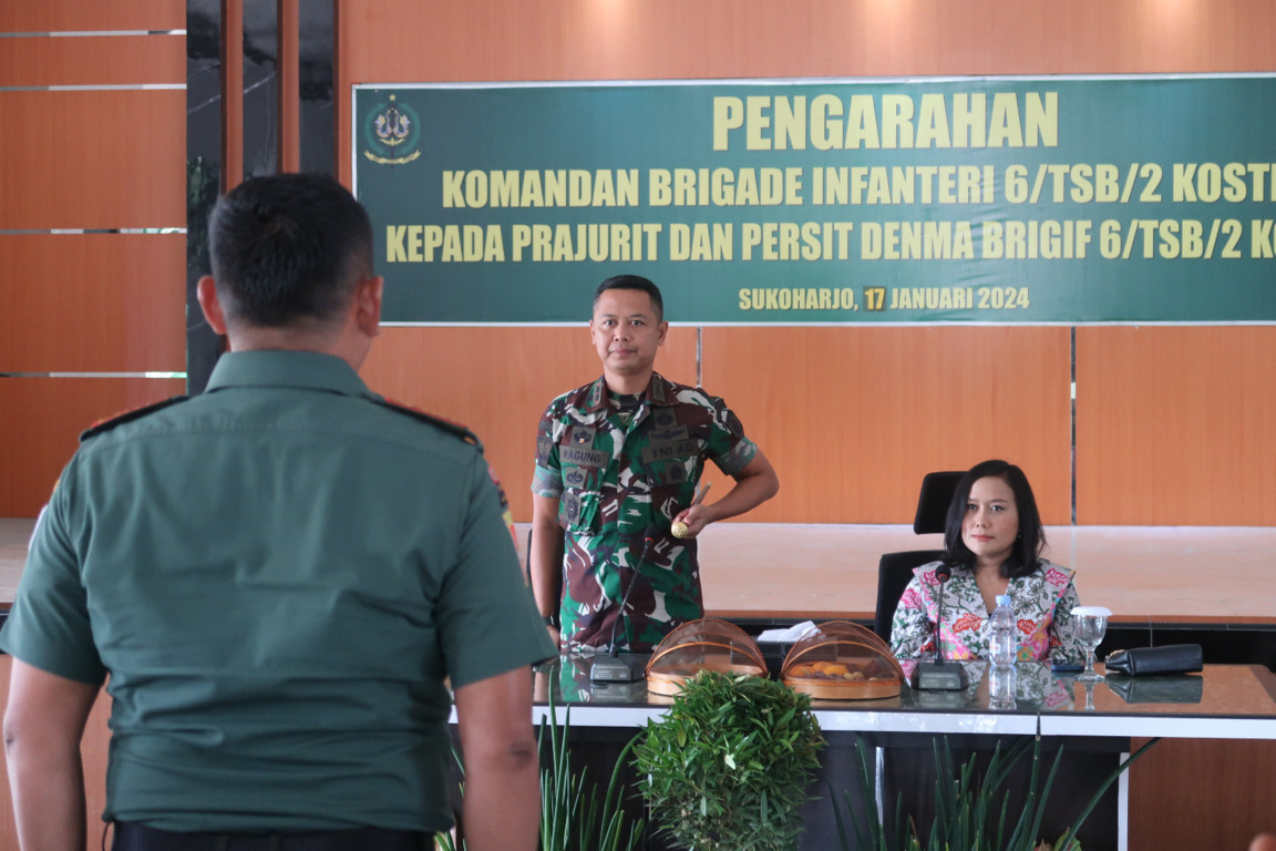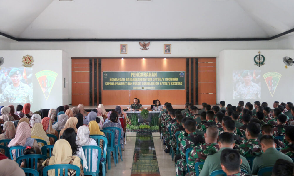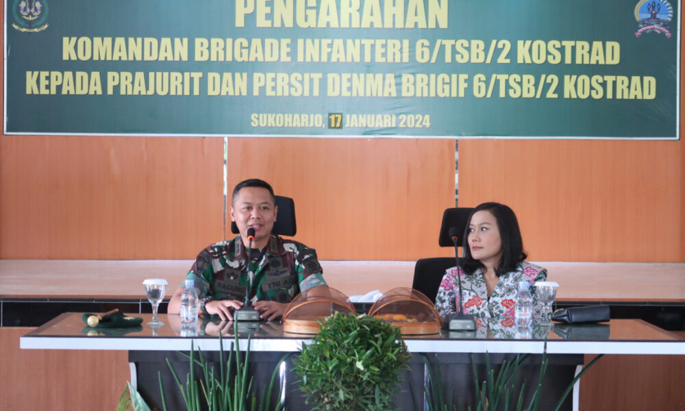 Pendiv2 – Danbrigif 6 Kostrad menggelar kegiatan pengarahan kepada prajurit dan persit sekaligus berpamitan sebelum melaksanakan tugas perdamaian dunia ke Lebanon. Acara ini digelar di Gedung Slamet Riyadi Brigif 6 Kostrad. Sukoharjo, Jawa Tengah. Rabu (17/01/24).