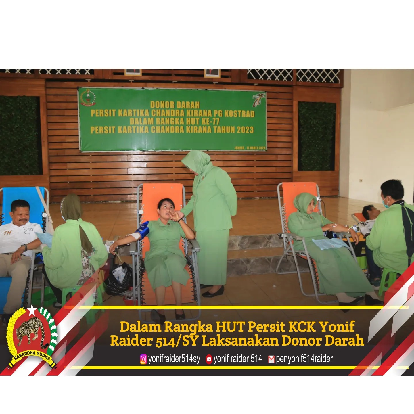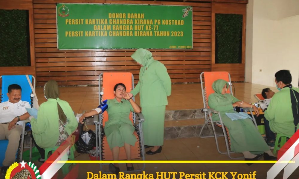 Pendiv2 – Dalam rangka menyambut HUT Persit ke-77 TA 2023 Prajurit Dan Persit Yonif Raider 514 Kostrad, Forkopimda dan masyarakat Jember sebanyak 500 orang melaksanakan Bhakti Sosial Donor Darah bertempat di Aula Soedirman Markas Brigif Raider 9 Kostrad, Jumat (17/03/2023).