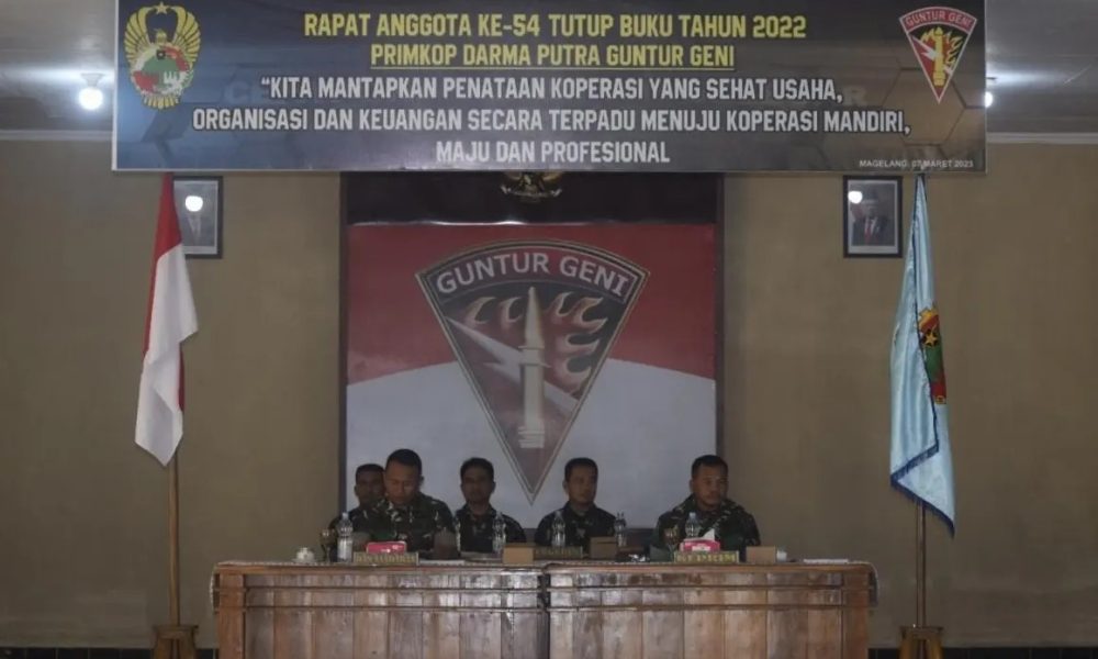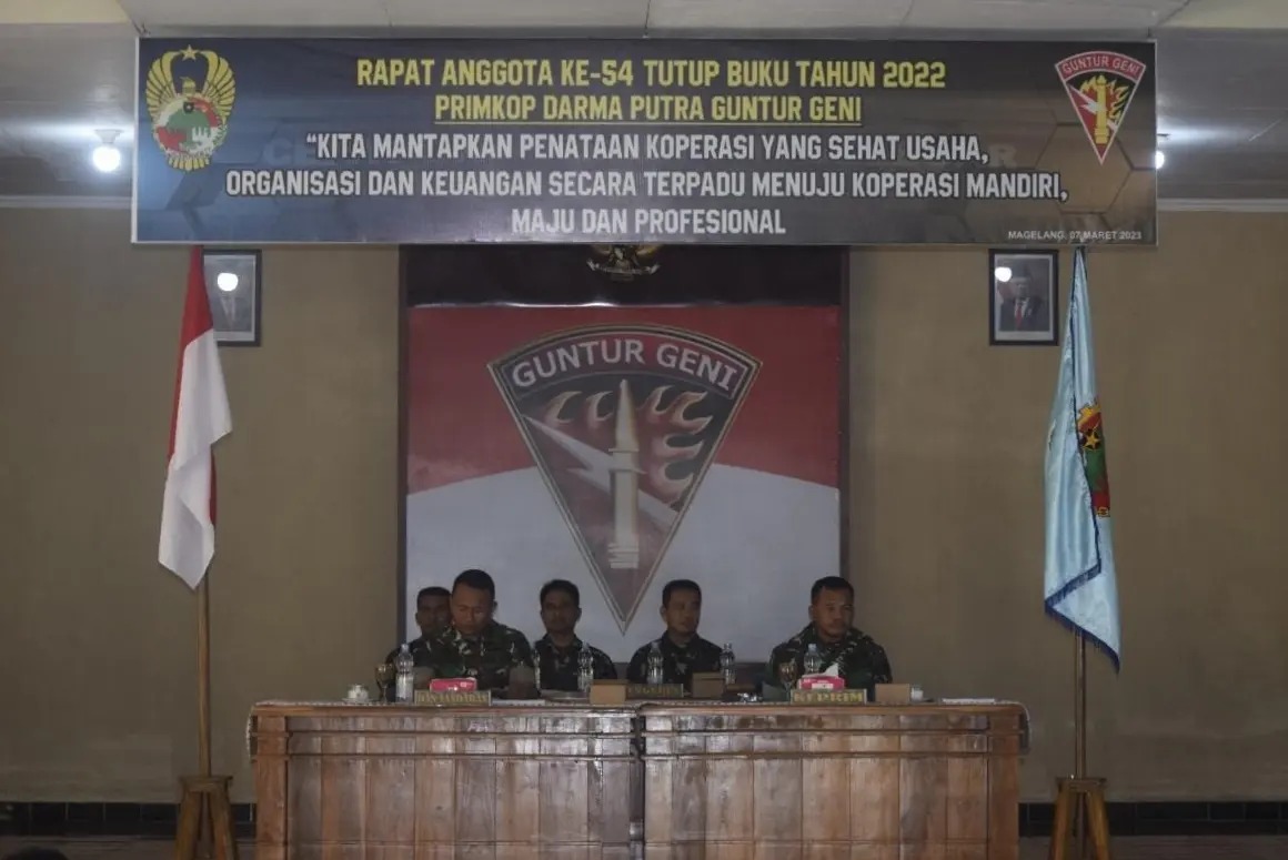 Pendiv2 – Dalam rangka melaksanakan laporan pertanggungjawaban Pengurus Primer Koperasi (Primkop) Dharma Putra Guntur Geni, kegiatan Rapat Anggota Tahunan (RAT) tutup buku tahun 2022 dengan tema “Kita mantapkan penataan koperasi yang sehat usaha, organisasi dan keuangan secara terpadu menuju koperasi mandiri, maju dan profesional” yang bertempat di Aula Gedung Guntur Geni (G3) Yonarmed 11 Kostrad Gelangan, Kec. Magelang Tengah, Kota Magelang Jawa Tengah, Selasa (07/03/2023).