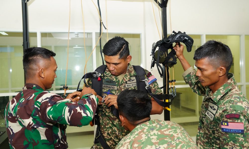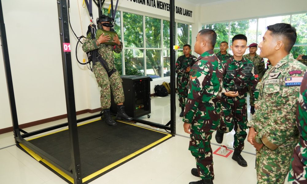 Pendiv2 – Dalam rangkaian Latihan Bersama Linud Malindo-8, personel Tentara Diraja Malaysia dan prajurit Yonif 503/MK berkesempatan mencoba Virtual Reality Parachute Simulator (VPRS) milik Divif 2 Kostrad. Malang (18 September 2025).
