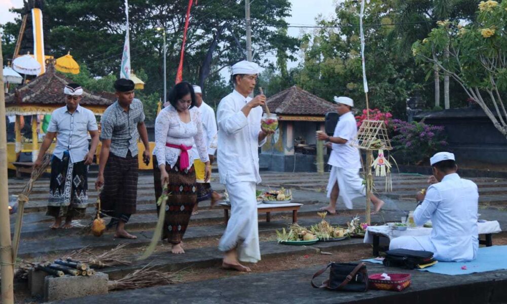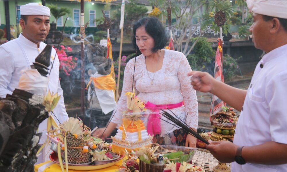 Pendiv2 – Umat Hindu dan Prajurit Yonif 514/SY/9/2 Kostrad beserta keluarga yang beragama Hindu melaksanakan kegiatan Persembahyangan bersama umat Hindu sekabupaten Bondowoso di Pura Tri Mandala Giri Yonif 514/SY/9/2 Kostrad dalam rangka Hari raya Galungan dan Kuningan, Curahdami, Kabupaten Bondowoso. Rabu (28/02/2024).