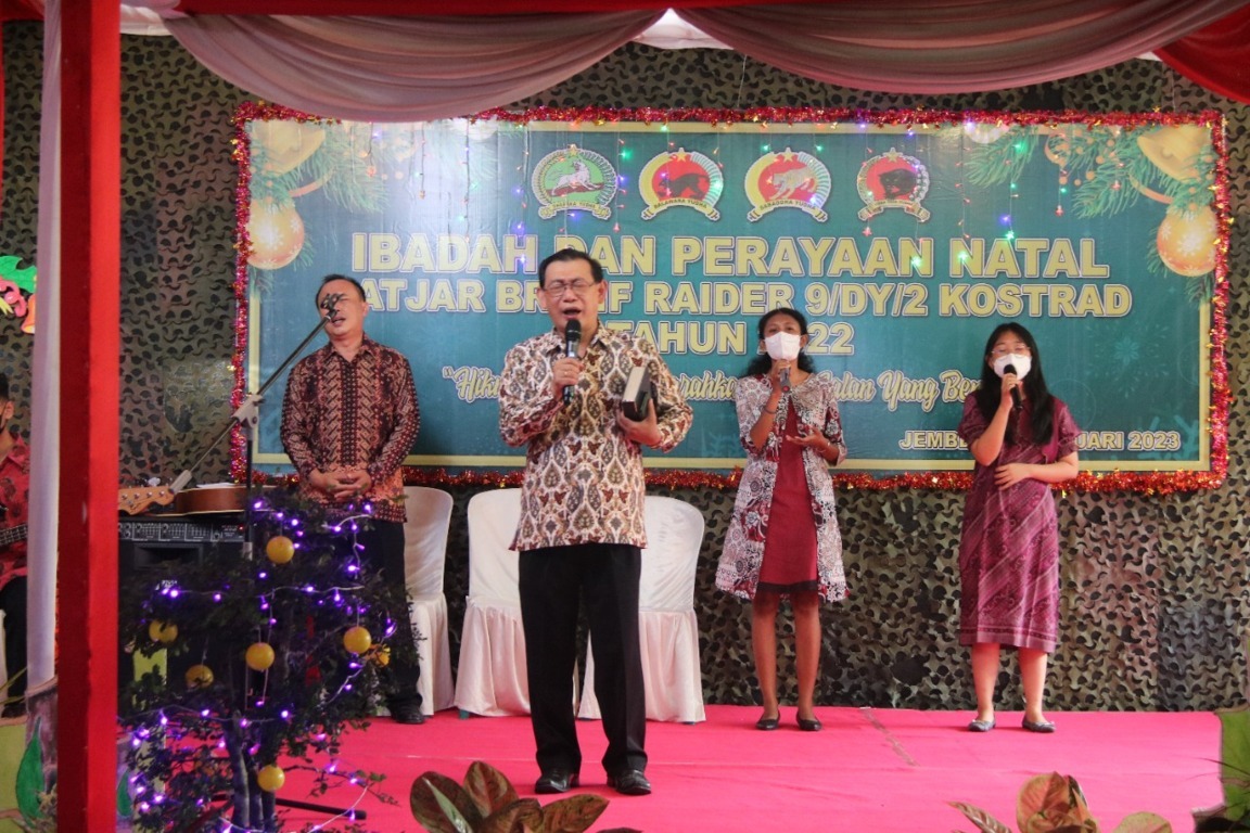 Pendiv2 – Prajurit dan Persit Satjar Brigif Raider 9/DY/2 Kostrad yang beragama Nasrani mulai dari Denma Brigif Raider 9/DY, Yonif Raider 514/SY dan Yonif Raider 509/BY menggelar Acara Ibadah dan perayaan Natal tahun 2023 di Mayonif Raider 515/UTY/9/2 Kostrad. Tanggul, Jumat (06/01/23).