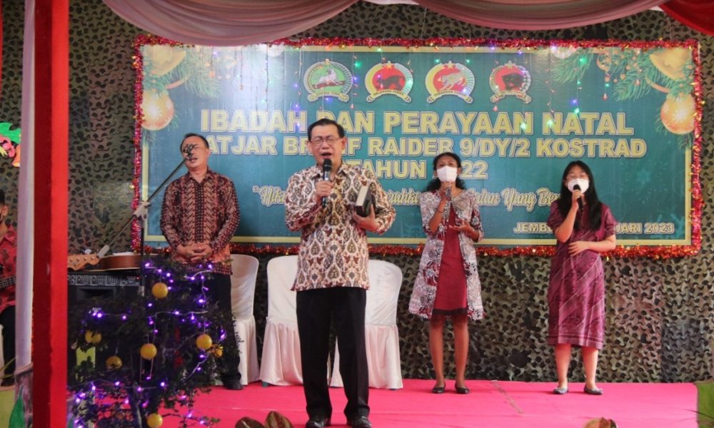 Pendiv2 – Prajurit dan Persit Satjar Brigif Raider 9/DY/2 Kostrad yang beragama Nasrani mulai dari Denma Brigif Raider 9/DY, Yonif Raider 514/SY dan Yonif Raider 509/BY menggelar Acara Ibadah dan perayaan Natal tahun 2023 di Mayonif Raider 515/UTY/9/2 Kostrad. Tanggul, Jumat (06/01/23).